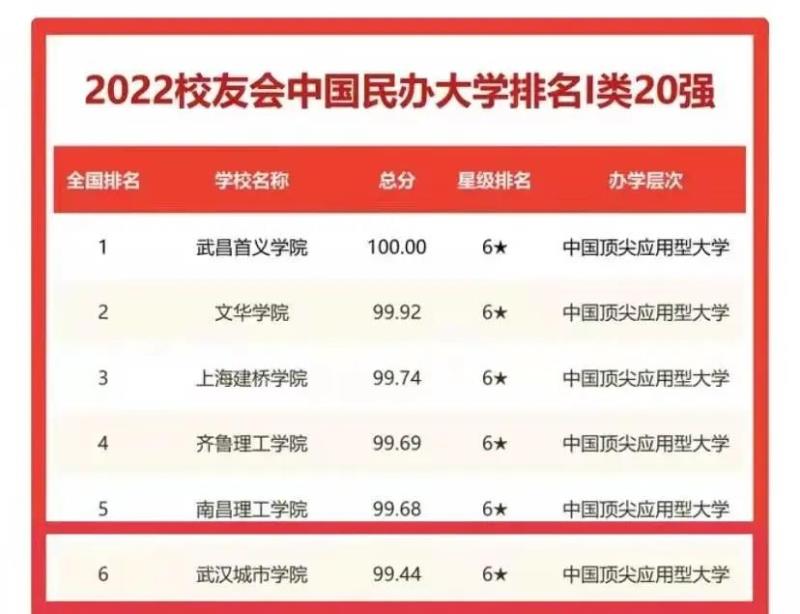 新闻网讯1月25日,全国第三方大学评价机构艾瑞深校友会网(Cuaa.Net)发布2022校友会中国民办大学排名20强。武汉城市学院以99.44分位列民办高校第6名,获评六星级中国顶尖应用型大学。