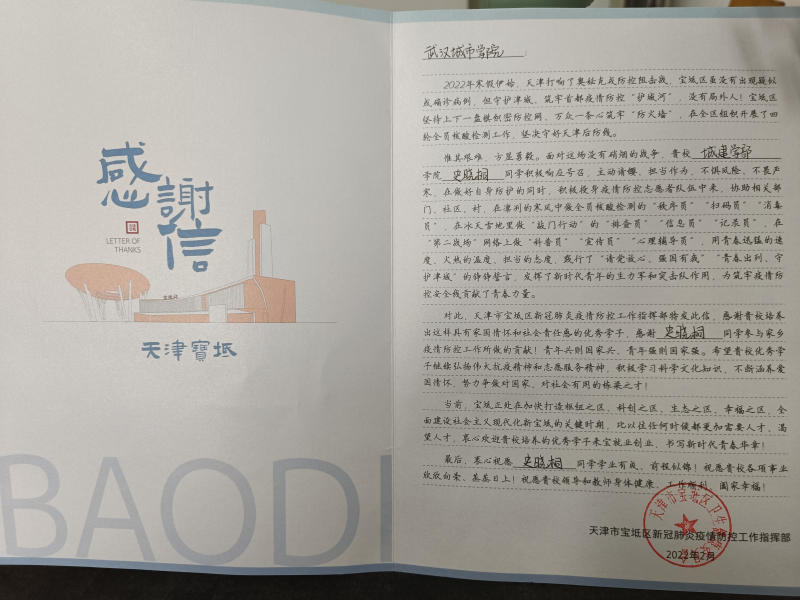 新闻网讯(记者袁晚露)近日,天津市宝坻区新冠肺炎疫情防控工作指挥部向我校致感谢信,感谢我校城建学部学生史晓桐参与家乡疫情防控工作所做的贡献,感谢学校培养具有家国情怀和社会责任感的优秀学子。