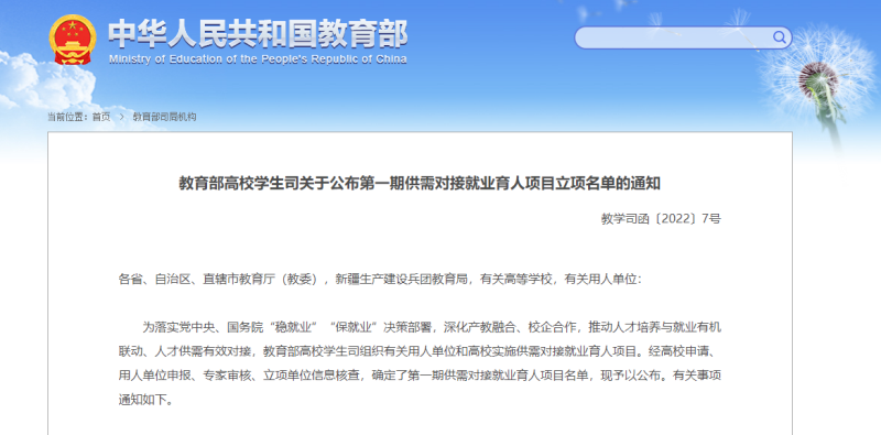 这是教育部首次实施供需对接就业育人项目,旨在推动就业与培养有机联动、人才供需有效对接,帮助用人单位培养和招聘更多实用型、复合型和紧缺型人才,促进高校毕业生更加充分更高质量就业。