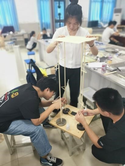 “做梦都梦到自己在做塔。”面对复杂的赛题,参赛队员们首先在平时的练习中克服了时间紧、任务重、材料对身体的影响等多重困难,从校赛结束之后,3个多月的时间,每天除了上课时间之外,空闲时间就顶着大太阳走到城建学部110教室做模型,一直到考试结束余下的半个月,在模型制作室吃喝午睡,累了,就轮流趴桌子上休息,软件使用迈达斯基础在老师们的指导下和自学下从无到有,一步步完善。