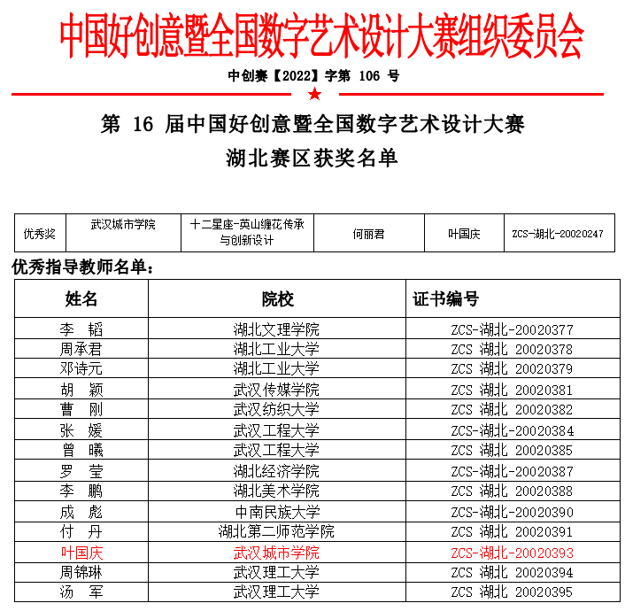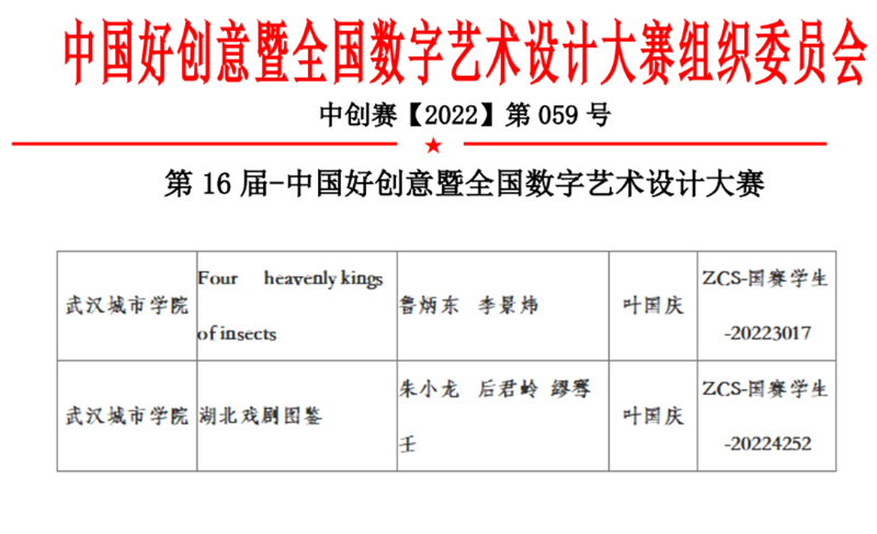 中国好创意暨全国数字艺术设计大赛,简称3C大赛或“中国创意挑战大赛”,是入选教育部中国高等教育学会发布的《全国普通高校学科竞赛排行榜》赛项,是我国数字艺术设计创意及数字技术创新领域各专业综合类规模大、参与院校多、影响广泛的权威赛事。我校学生首次参加该项竞赛,叶国庆带领学生在同武汉大学、华中科技大学等名校的竞争中斩获2项国赛三等奖、1项省赛优秀奖。