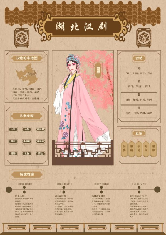 国赛三等奖作品《湖北戏曲图鉴》,作者为2019级视觉传达设计2班学生后君岭、朱小龙、程嘉恒、缪骞壬。该作品以信息图表的设计形式,分析湖北传统戏曲、汉剧与黄梅戏的戏曲文化特征,通过设计语言将相关内容具体化,展示了汉剧与黄梅戏的行当、经典剧目、服饰、体制的变迁。