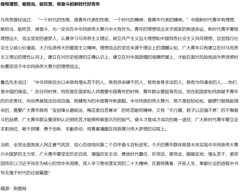 新闻网讯 10月22日,党的二十大胜利闭幕;10月23日,新一届中央领导集体产生。喜讯传来,我校上下精神振奋、信心满怀。10月24日,我校党委书记王军在省级媒体荆楚网发表理论文章——《不负青春年华实现伟大梦想》,畅谈学习领悟党的二十大报告精神体会,受到广泛关注。