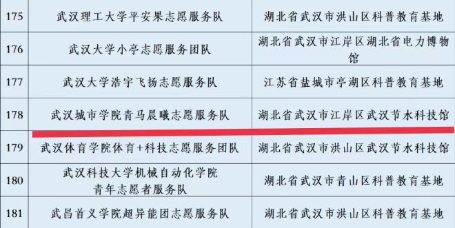 我校“青马晨曦”志愿服务队创建于2017年11月,在学校党委组织部教师的指导和带领下,积极投身志愿服务项目。积极贯彻“奉献、友爱、互助、进步”的志愿服务精神,与湖北省图书馆、湖北省慈善总会、武汉市地铁集团、武汉市血液中心、武汉市精神卫生中心、武汉市三医院、武汉市残联等多家单位达成长期志愿服务合作,同时参加了第七届世界军人运动会、武汉市马拉松等多项大型赛事志愿服务活动。该团队曾荣获武汉市级“本禹志愿服务队示范团队”、武汉市“学雷锋活动示范点”、武汉地铁“优秀志愿者服务共建单位”、武汉马拉松“优秀志愿者合作高校”、武汉市献血办“凡人善举 善小而为”奖牌,黄鹤楼残联会关爱残疾人士“优秀志愿服务团队”,湖北省慈善总会“一张纸献爱心”活动“示范高校”,2019年武汉马拉松官方啦啦队”亚军。2021年,该团队在宜昌九畹溪开展支教志愿服务,荣获武汉市2021年度学雷锋志愿服务“四个一批”先进典型。2022年,被选入团中央七彩假期示范团队到保康县岞峪进行小学支教项目。