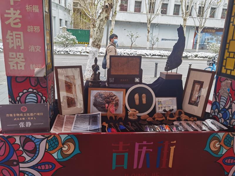 张静作为木雕的非遗传承人,曾先后参加江岸区非遗助力武汉书展、武汉市宣传党的二十大精神非遗作品展,此次也受邀参加了活动。张静紧扣宣传武汉木雕特点,提前精心准备展品,花费不少心思。在她的摊位上,展品样式繁多、种类丰富:有传统的、现代的木雕、圆雕、浮雕、镂空雕、现代文创产品,为湖北省博物馆开发的文博产品,体验课宣传册和张静写的两本关于非遗木雕的书籍......琳琅满目的展览吸引了市民们前来围观。其中,最抓人眼球的非张静摊位上活灵活现的“小兔子”莫属,憨态可掬的模样也吸引了央视记者、省电视台记者们。张静说:“正好是兔年伊始,前三年武汉也一直因为疫情封控、过年都没有今年这般热闹的氛围,为了展示生肖文化特点,为了呼应喜庆的氛围,于是创作了这只沐浴的兔子。”
