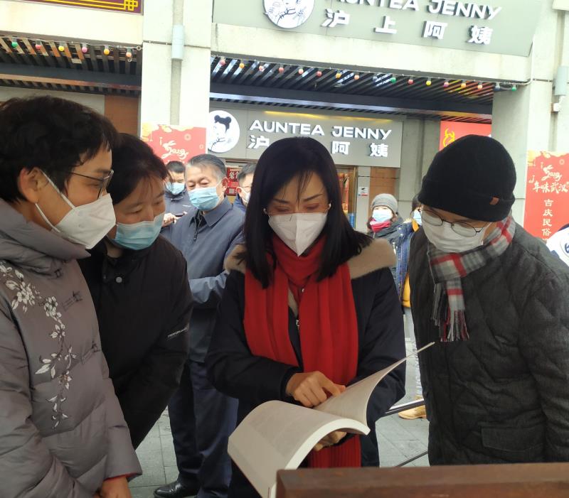 (图为武汉市文化和旅游局的肖局长,到吉庆街巡视,来到武汉木雕展示台,向张静询问关于非遗传承方面的情况)
