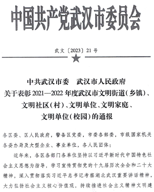 新闻网讯(记者徐昱诚 摄影吴冬丽)近日,中共武汉市委,武汉市人民政府下发《关于表彰2021—2022年度武汉市文明街道(乡镇)文明社区(村)、文明单位、文明家庭、文明单位(校园)的通报》,我院顺利通过2021—2022年度武汉市文明校园复核。
