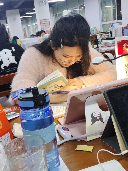 “会计专业竞争太大,我今后不打算从事会计方面的工作,所以选择跨专业考研。我是从去年4月下旬才开始准备,整个备考时间8个月左右,零基础学习和短时间准备让我感到焦虑,但我很快调整自身状态,告诉自己不要受外界影响,要专注于当下。”在制定好计划表后,潘语欣便全身心投入到第一轮备考中,背完一轮知识点再二刷,发现知识点又不记得是常态。在这期间,潘语欣没有自怨自艾,而是一步一个脚印,扎扎实实继续备考。