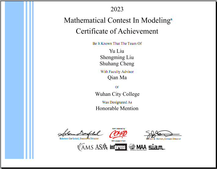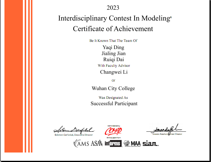 新闻网讯(通讯员 李长伟)近日,2023年美国大学生数学建模竞赛(MCM/ICM)结果揭晓,我院3支参赛队伍全部获奖,其中二等奖(HonorableMention)1项、三等奖(Successful Participant)2项。这是我院学子在该项赛事中首次荣获二等奖,标志着我院数学建模水平正在稳步提高。