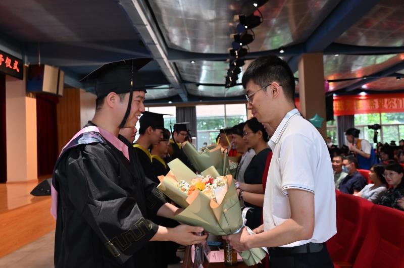 优秀毕业生代表向老师赠送鲜花,表达感谢之情。