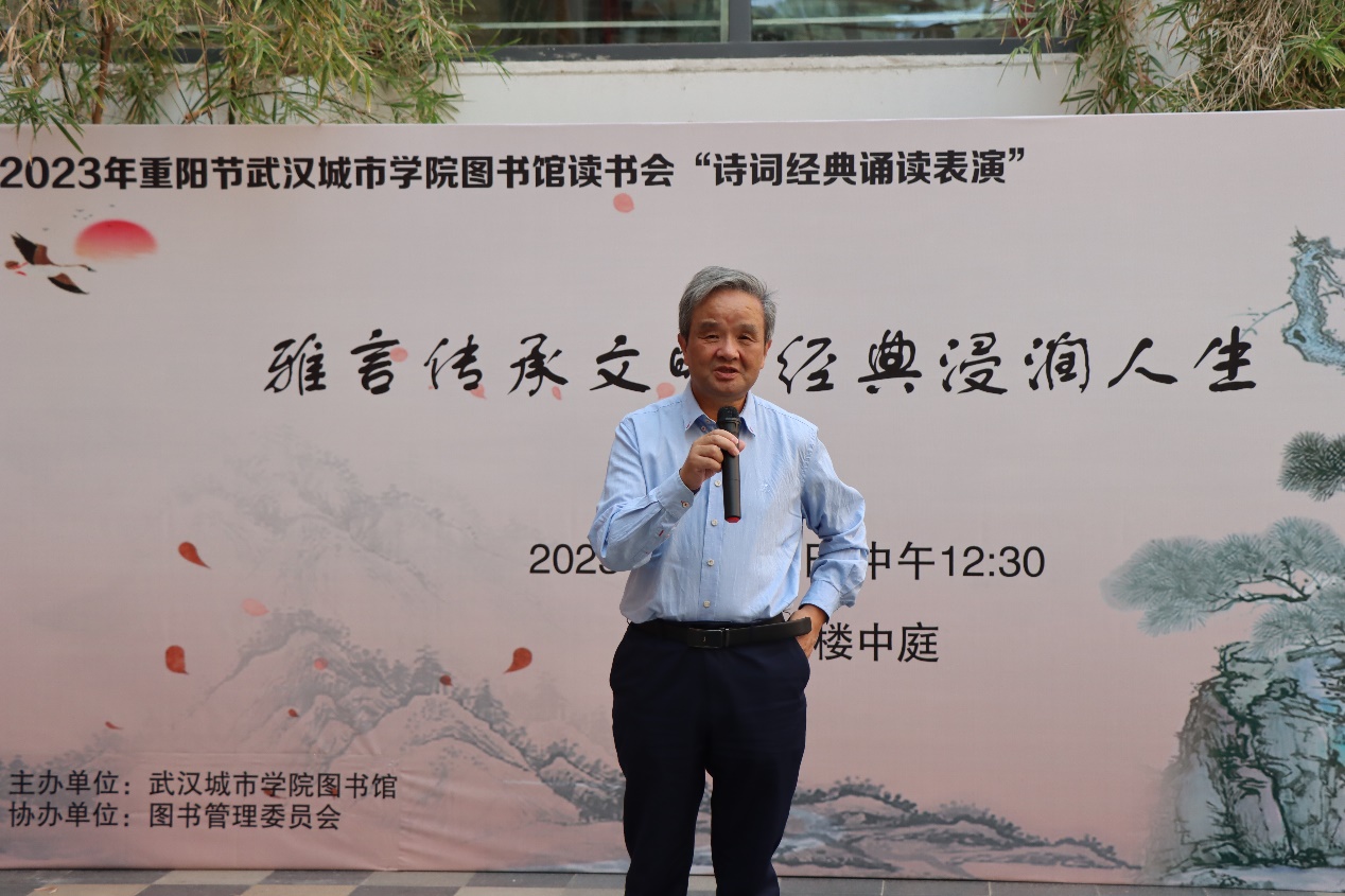 图书馆直属党支部书记石顺利表示,重阳节承载着寄望追思的感怀之情和敬老爱老的优良文化基因,诵读经典诗词是对经典文化的传承和弘扬,这两者结合也是对中华传统文化的一种尊重和表达。举办此次活动,旨在通过诵读文学经典的形式弘扬中华传统文化,展现我院学子良好的精神风貌,着力打造了书香气息浓厚的清雅校园。