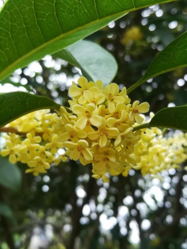 沁人心脾的馥郁芳香随风萦绕,四叶花瓣、数点黄蕊、一茎青梗,攒在一起便是一朵朵轻柔的桂花,为这清秋季节平添不少香气。一阵秋风袭来,枝叶“沙沙”作响,花瓣飘散而下,地上铺满金黄。开花时奉献幽香,花散时坦然入地,走在学院桂花树下的师生,享受着这一路的清软香氛,珍惜着每年此刻似玉生香的黄色精灵。