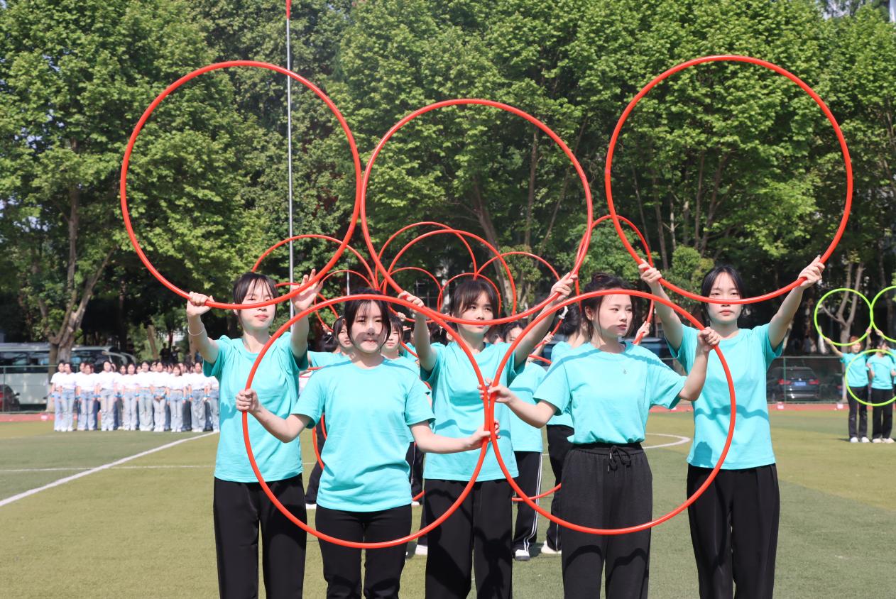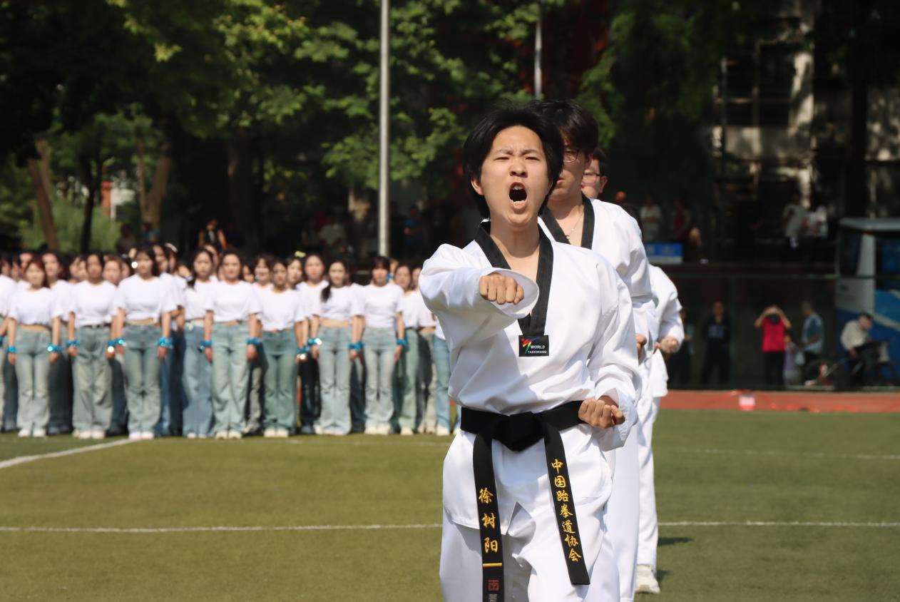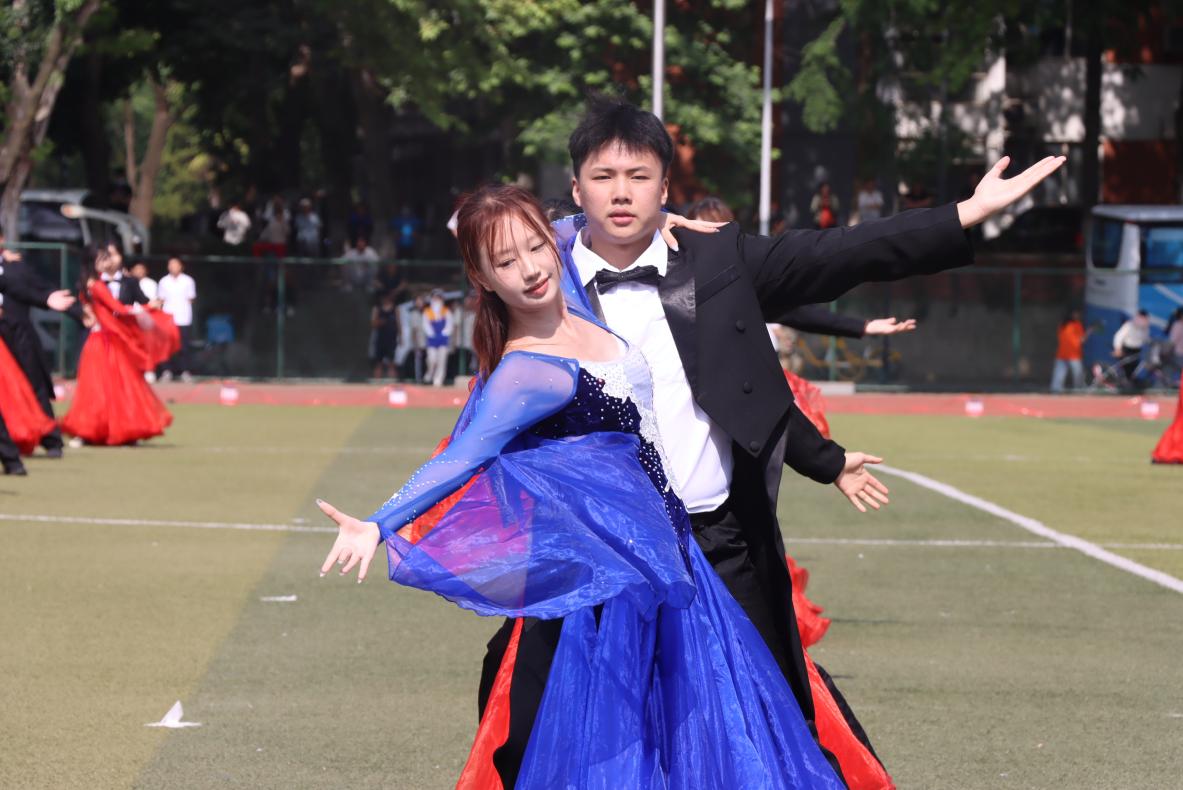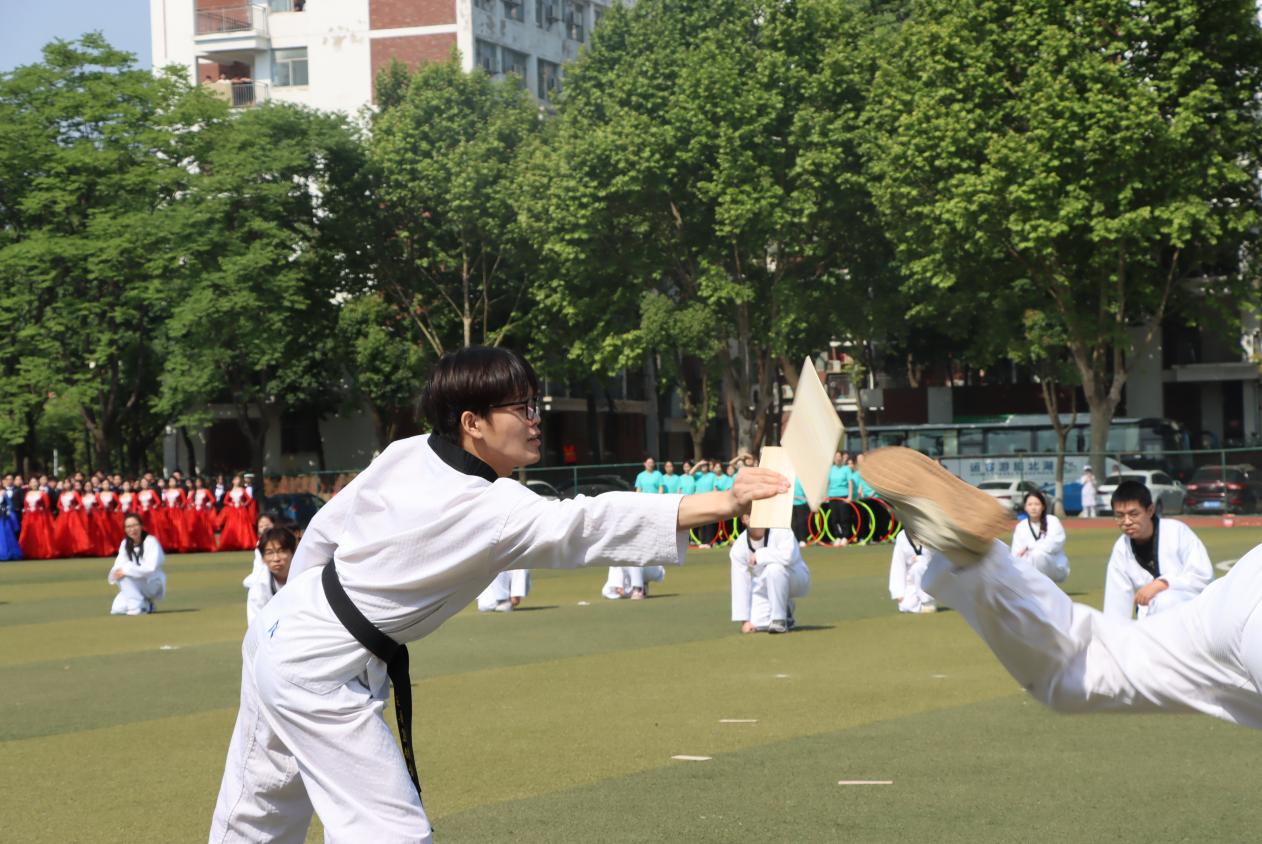 “山河壮丽”篇章中,身着华美礼服的维也纳华尔兹舞者,以曼妙的舞步,在阳光下翩翩起舞,他们手挽手,一步一步地旋转起来,成为了一幅绝美的画卷,宛若画笔般勾勒出祖国山河的雄伟与瑰丽。“同心共圆”篇章,巧妙地将艺术体操的圈操、柔力球与彩带龙等元素融合在一起,展现出团结合作、和谐共生的主题。他们的动作流畅而优美,仿佛在空中绘制出一幅绚丽多彩的图案。“时代强音”篇章,学生们以跆拳道表演为主轴,展示着城院学子们强健的体魄和奋发向上的精神风貌。他们身姿矫健,动作准确,每一次腿踢、拳击都充满了力量和激情,正如一支铿锵的乐章,奏响着青春的强音。“强国有我”更是将现场气氛推向了高潮,620人同时在场上进行舞狮、拉丁舞等表演,将传统文化与现代元素巧妙融合,既有传统文化的韵味,又有现代时尚的气息,展现了城院学子们对国家的文化自信与活力。