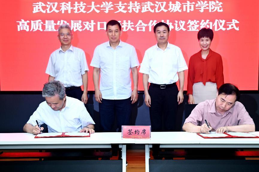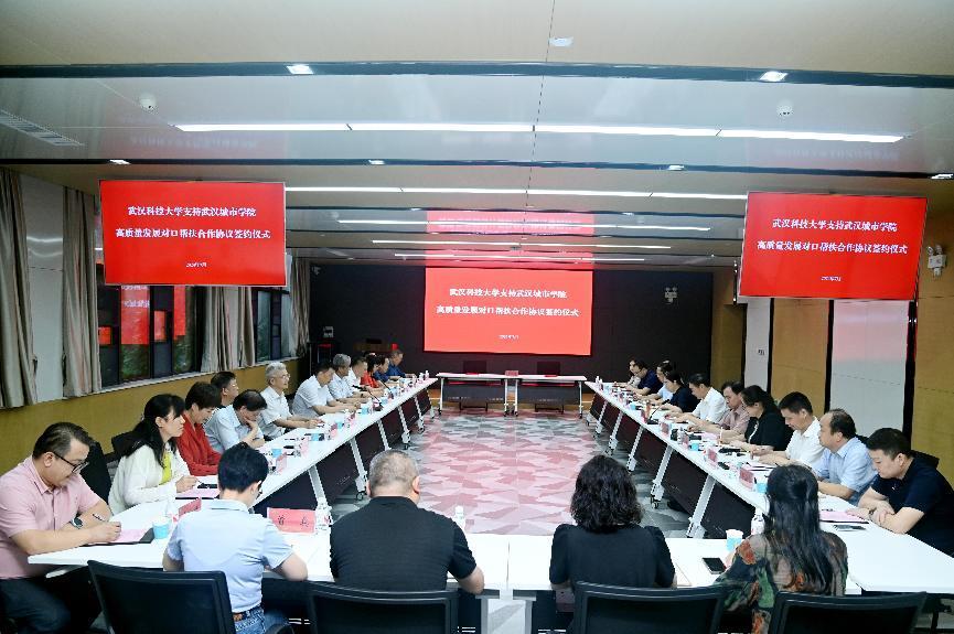新闻网讯(记者 徐璐) 7月1日下午,武汉科技大学支持武汉城市学院高质量发展对口帮扶合作协议签约仪式在武汉科技大学图书馆隆重举行,两校携手开启合作新里程。武汉科技大学党委书记徐雁冰、党委副书记孙国胜,武汉城市学院董事长吴文刚,武汉城市学院校长陈建勋,武汉外语外事职业学院校长盛建龙,武汉外语外事职业学院董事长吴翠红和武汉城市学院全体校领导出席签约仪式。签约仪式由城市学院党委书记肖军主持。