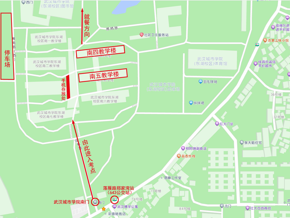 3、建议考生绿色出行。考生可乘坐轨道交通4号线(武汉站方向),在武汉火车站换乘643路公交车至郑家湾站下车;或乘坐轨道交通5号线(武汉站东广场方向)至厂前地铁站C出口,步行206米至团结大道地铁厂前(公交站),转乘公交643路至郑家湾站下车。下车后直接从学校南门进入,步行100米即可到达考区教学楼。