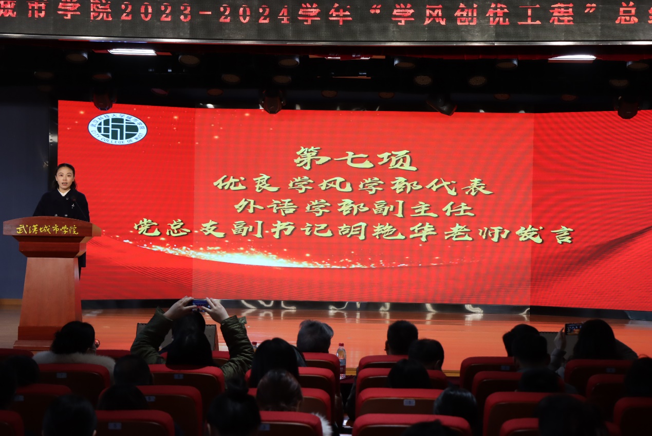 “优良学风学部”代表,外语学部副主任、党总支副书记胡艳华老师上台发言。她总结了外语学部所取得的优秀成绩,并分享了外语学部在长期实践中形成的1531学风创建法:“1”是坚持一个核心宗旨,以学生为中心;“5”是开展专项,全方位育人,包括活动育人、资助育人、心理育人、环境育人、就业育人五方面;“3”是坚持三个层面建设学部,即学部层面、班级层面和宿舍层面,实行上下联动、师生分级协同管理模式;“1”是培养一支优秀的队伍,务实高效的学工团队。她表示,外语学部学工团队将站在新的起点继续以先进的工作理念,创新的工作方法,打造优良学风,促进学生综合素质发展。