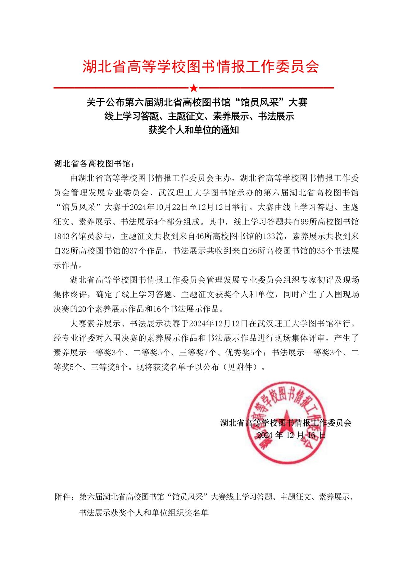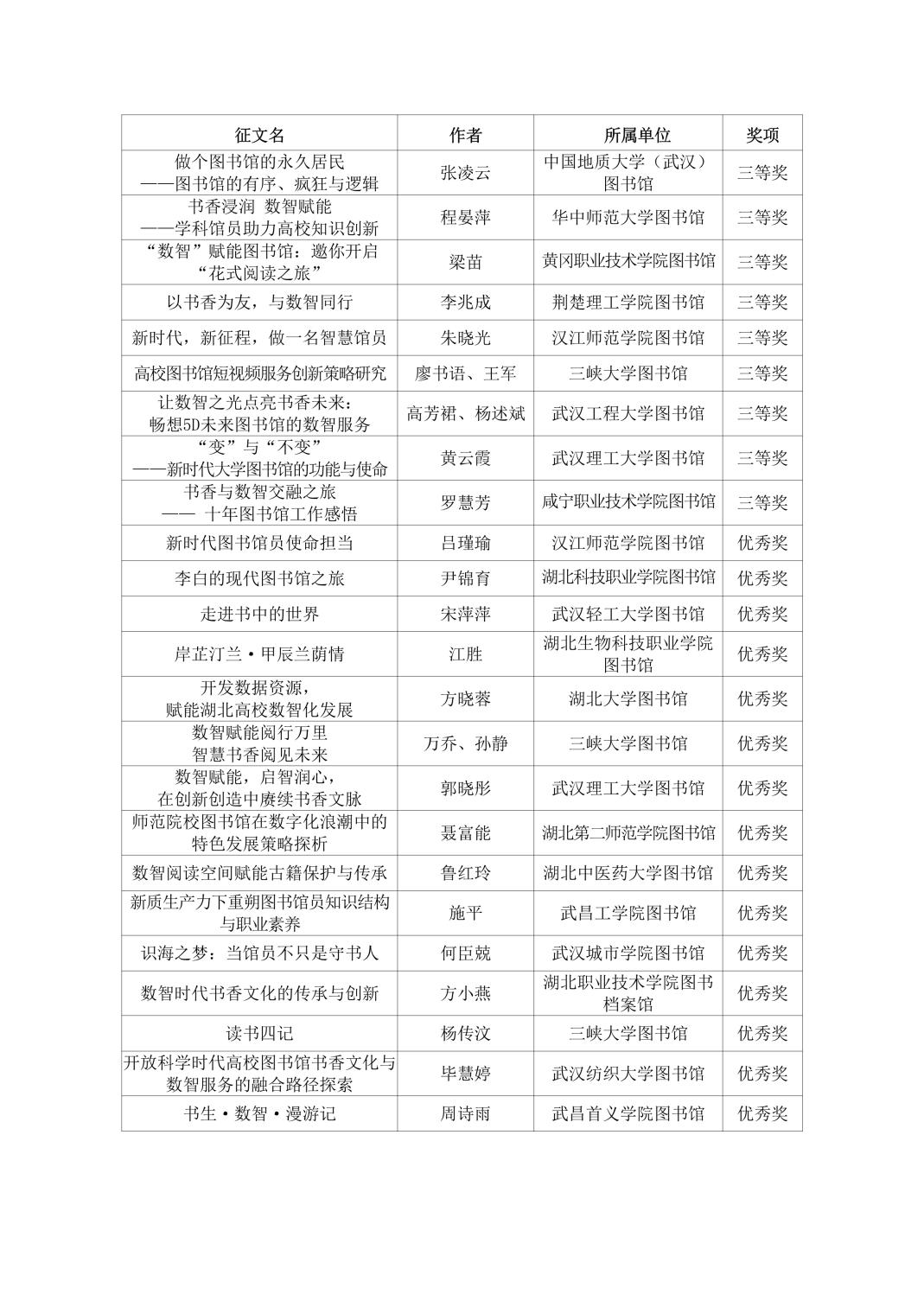 第六届湖北省高校图书馆“馆员风采”大赛由湖北省高等学校图书情报工作委员会主办,湖北省高等学校图书情报工作委员会管理发展专业委员会、武汉理工大学图书馆承办,于2024年10月22日至12月12日举行,其中,主题征文共收到来自46所高校图书馆的133篇。