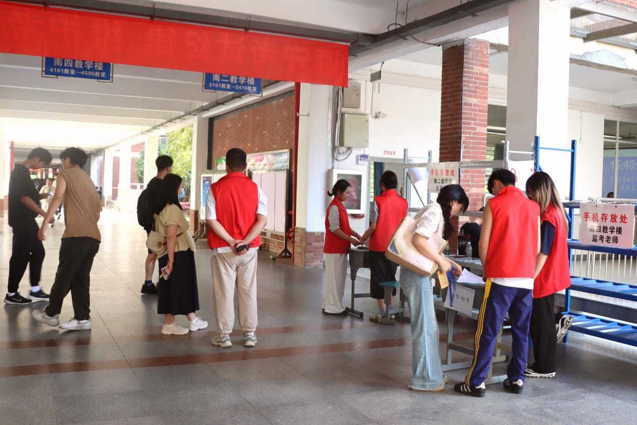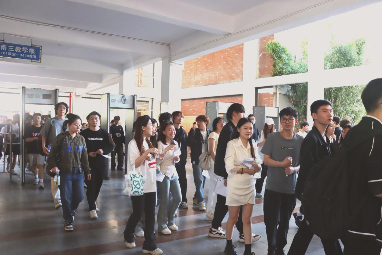 考场外20余名学生志愿者全程参与考务保障工作。志愿者们身着统一标识马甲,清晨便抵达考场,协助完成考生引导、材料分发、突发问题处理等任务。考试期间,他们穿梭于走廊间,为需要帮助的考生及时提供指引,确保入场流程高效有序。