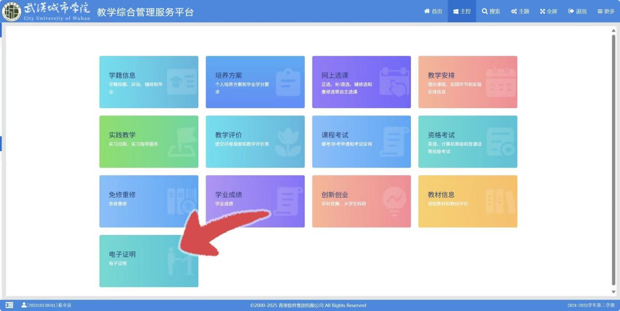 进入【电子证明】页面后,在“服务项目”一栏选择“成绩档案表/在读证明”并点击“操作”一栏中的【申请】。