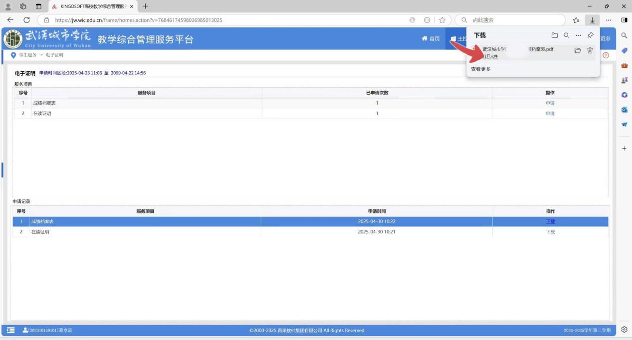 下载后,在浏览器的下载栏中可以找到已下载好的pdf格式的“成绩档案表/在读证明”,打开文件即可查询。