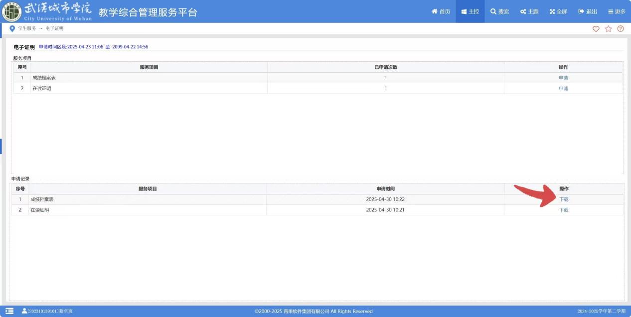 点击申请后,在下方“申请记录”一栏中会弹出已申请的“成绩档案表/在读证明”,点击“操作”一栏中的【下载】。