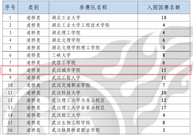 此次大赛道桥类全省共决出奖项135名(其中一等奖27名,二等奖40名,三等奖68名),我校城建学部道桥类代表队获奖16项,在省内高校中名列前茅,约占总奖项数的八分之一。并获得入围全国总决赛的推荐名额15个,紧随武汉科技大学、武汉理工大学余家头校区之后,在该类别的全省高校中排名第三、民办高校中排名蝉联第一,谱写了新的历史篇章。