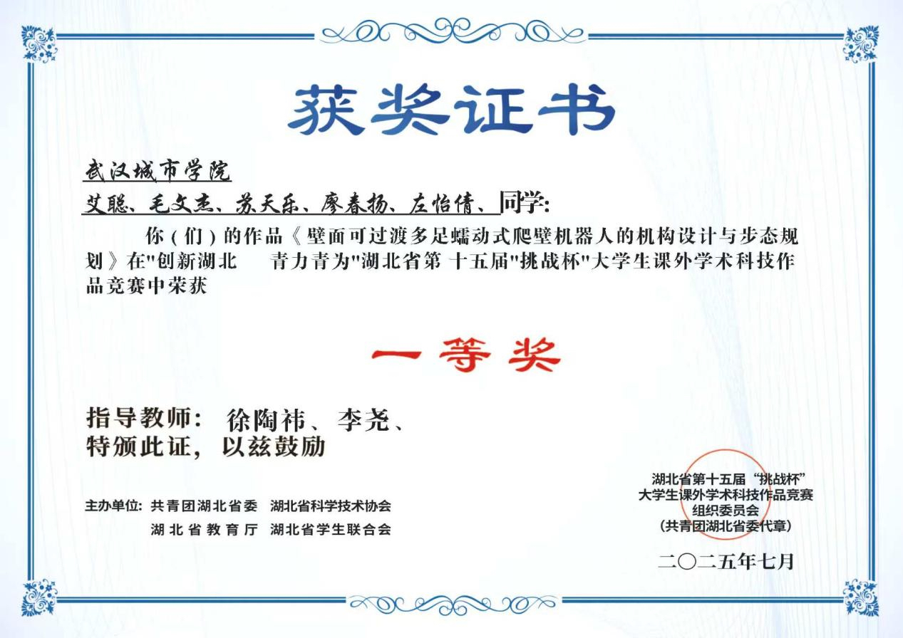 比赛是徐陶祎教学工作的“高光板块”,她不仅用专业指导学生突破技术难关,更带领团队在国家级赛事中实现学院突破,累计以第一指导老师身份斩获各级奖项 50 余项。最让她难忘的,是一次爬壁机器人项目的攻坚。当时团队为二级团队,作品初评时评委直言 “难度太大,做不出来”,连队长都萌生退意。离决赛只剩两周,机器人仍无法流畅爬壁,团队成员士气低落。“我跟他们说,评委说难度大,不是说我们做得差,是觉得这个方向有价值!还有一周,咱们拼一把!” 在她的鼓励下,学生们把床铺搬到了实验室,“累了就躺一会儿,醒了就接着干。” 最终,团队不仅让机器人流畅完成爬壁动作,还拿到了奖项。“后来队长跟我说‘老师,不怪你当初逼我们了,现在好开心’。” 说起这段经历,徐陶祎的眼里满是欣慰,她知道,这种一起攻坚的经历,会成为学生一辈子的财富。