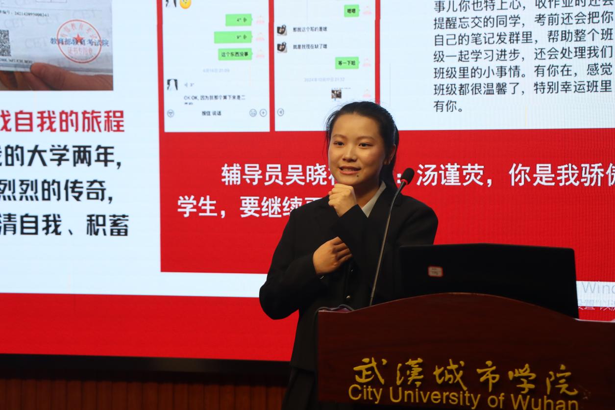 评审会上,24名本科候选人、14名专科候选人按抽签顺序依次登台答辩。他们结合PPT展示及个人陈述,围绕思想成长、学业成绩、科技创新、社会实践与志愿服务等多维度进行风采展示,全面且生动地展现了在校期间的综合素质与成长收获。评委们遵循公平、公开、公正、择优的原则,认真听取每位候选人的汇报,通过个人展示、材料复核、现场打分与集中评审环节,最终评选出彭若婷、汤谨荧等19位本科生、伍小雪、周航等10位专科生作为推荐人选。