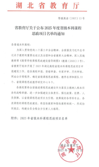 新闻网讯(通讯员 杨小帅 熊晶)近日,湖北省教育厅正式公布了2025年省级本科课程思政项目名单。经专家严格评审,我校课程思政教学研究中心凭借其扎实的工作基础、鲜明的建设特色与卓越的育人成效,成功入选省级课程思政教学研究中心。这是我校在深化教育教学改革、落实“立德树人”根本任务征程中取得的又一重大标志性成果。