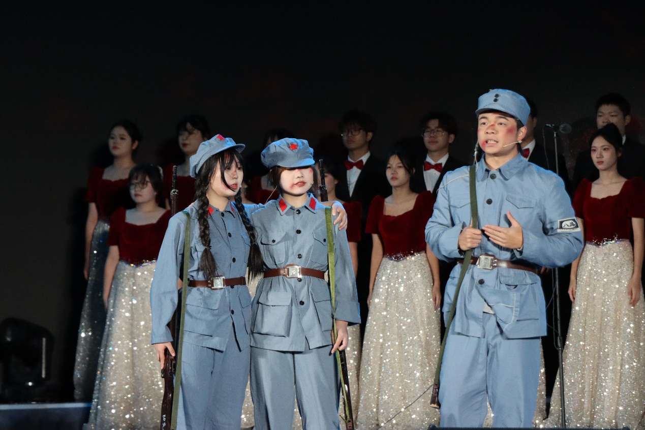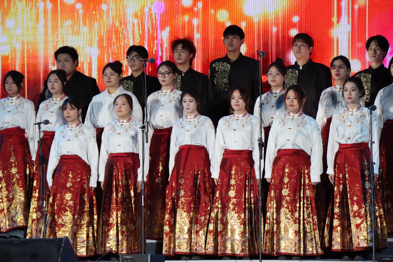 开场合唱《我爱你中国》在校艺术团合唱队的演绎下气势恢宏,歌声从雪域高原唱到江南水乡,将对祖国的深情礼赞融入每一个音符,瞬间点燃全场爱国热情。