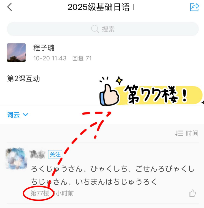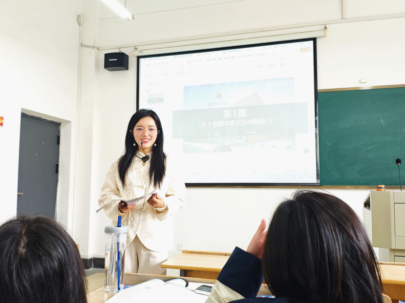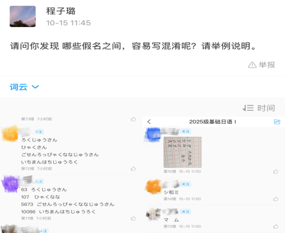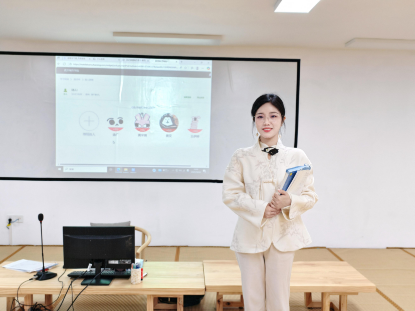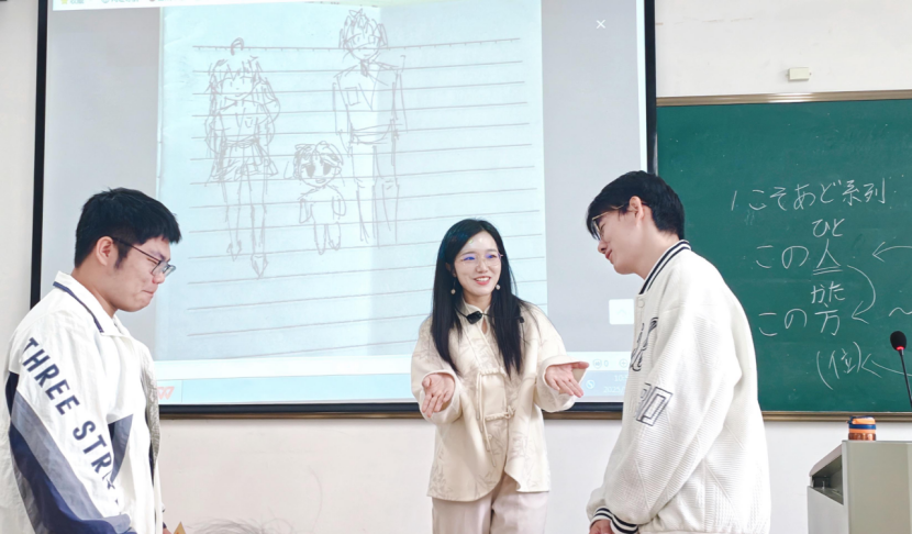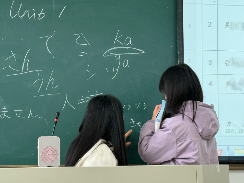 细致观察的背后是一颗温暖的慧心,程子璐老师关注的不仅是作业的对错,更是屏幕后每一个鲜活的个体。班里内向的张同学,课堂上几乎不敢开口读日语。程老师却从她学习通作业讨论里几次细微的犹豫而又胆怯的互动中,敏锐地察觉到了她的挣扎与努力。没想到,下课铃响后,日语1班的张光玲同学便受到了程老师的“特殊关照”:“你的作业我仔细听了三遍,有几个发音的小问题,别担心,我们单独说一下?”就这样,一次耐心的“课后加练”在教室里悄然展开。程老师一句一句地示范,小张同学一次一次地跟读。当张同学为一个发音困扰时,程老师敏锐地点出关键:“这个音需要想象一个微笑的口型,但嘴唇向两侧拉平,不要上下张合。同时,能感觉到下巴肌肉处于微微用力的状态,试试看?” 这样的精准指导,让她瞬间找到了发力感,发音也从生涩变得清晰圆润。“我从来没想过老师会为我一个人花这么长时间,”小张感动地说,“她连我哪里该用力、哪里该放松都听得一清二楚,那一刻,我觉得自己真的被看见了。”