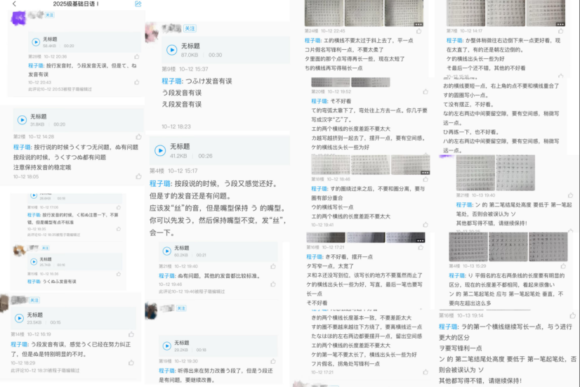 24小时在线“云监工”,你的努力“法眼”照单全收。课下的程子璐老师又摇身一变成了严格把关的“作业显微镜”,24名同学提交的24份作业,无论是需要逐字聆听的发音跟读、还是考验耐心的字帖练习、创意满满的日语配音、翻唱、自主创作的日语情景视频,在程老师这里总能得到不厌其烦的回复与指导。从“发音有误、横线写长一点”到“非常好!请继续保持”,每一笔一画的进步,都逃不过她的“火眼金睛”;每一字一句的瑕疵,她都悉心纠正。让学生们感到安心的是,24份提交记录的背后对应着24份学情记录,更有着雷打不动的24条详尽指导回复,这一切都被系统性地收录于24名学生的专属成长档案,让复杂的学情变得可视化,让每一步成长都有迹可循。这种“一个都不能少”的批阅承诺,让同学们直呼:“在程老师这里,永远没有‘已读不回’,只有‘已读必回’!”