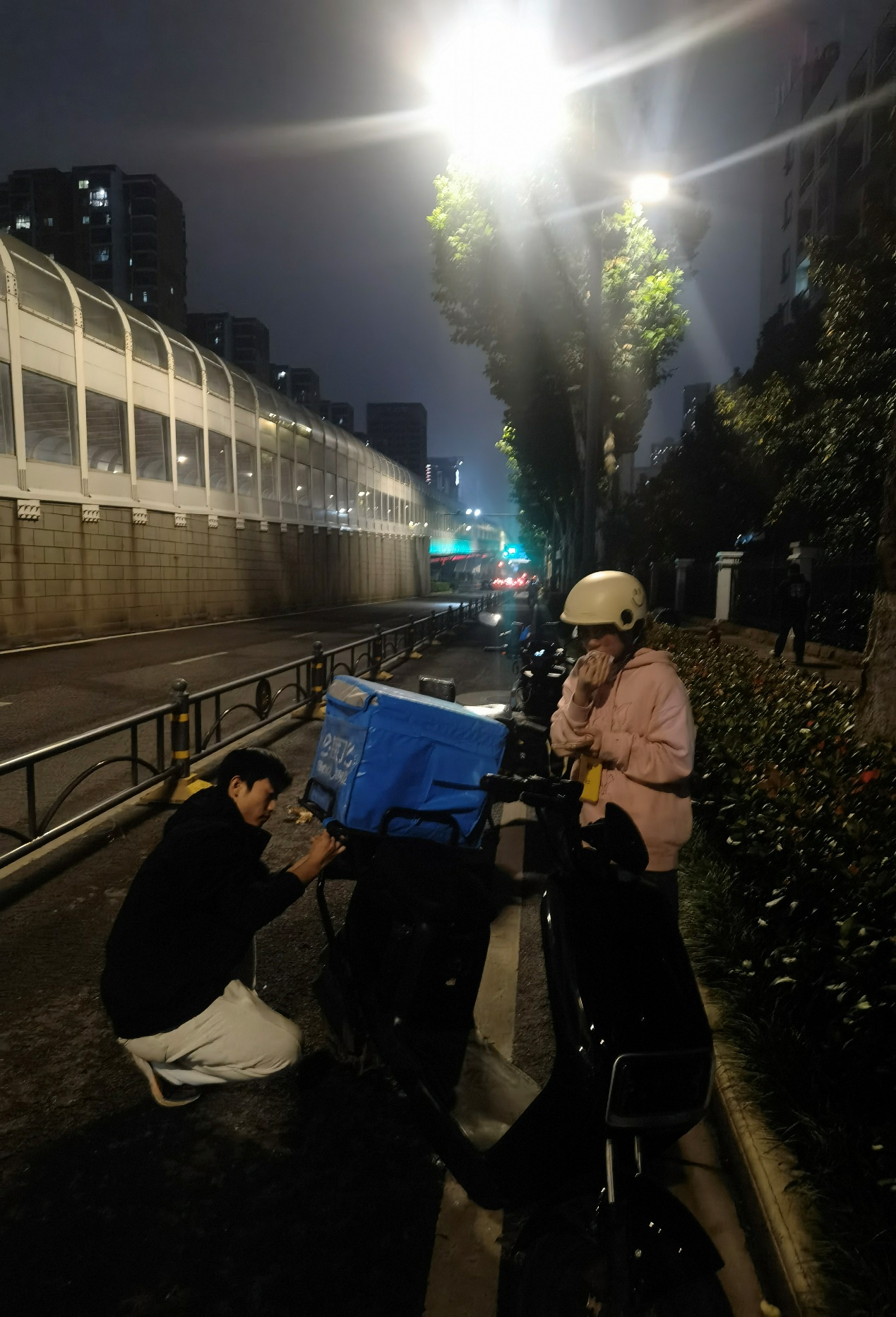 11月9日晚上,张奥文送完外卖回学校,在必经之路杨春湖地铁站A口,瞥见了一位同行正对着自己的电动车发愁。他停下车,主动上前询问。“当时有个骑手,他电动车的转接线坏了。”张奥文清晰地回忆着技术细节,“它是有两根线,一个正极,一个负极。他骑车骑得很快,电流释放得很大,两条线烧一块了,然后电池就卡那了。”了解到情况后,他的第一反应是帮对方寻找专业救援。“我就说附近有一个修电动车的店,我帮你看有没有关门。”然而,时间已晚,修车店早已关门。困境摆在眼前:车坏了,但对方有两个订单没送:一个是从金茂府小区旁的水果店取货后送往金茂府;另一个是送往武汉火车站附近的白马馨居二期东区。“那你用我的车子,我坐你后边。咱俩都戴着头盔……你骑我的车,你先把单子送了。”一场深夜的配送接力就此展开。陌生的骑手骑着张奥文的车,载着张奥文,带着自己的外卖餐品,踏上了紧急配送之路。张奥文则坐在后座,全程陪同。幸运的是,这两个订单最终都没有超时。