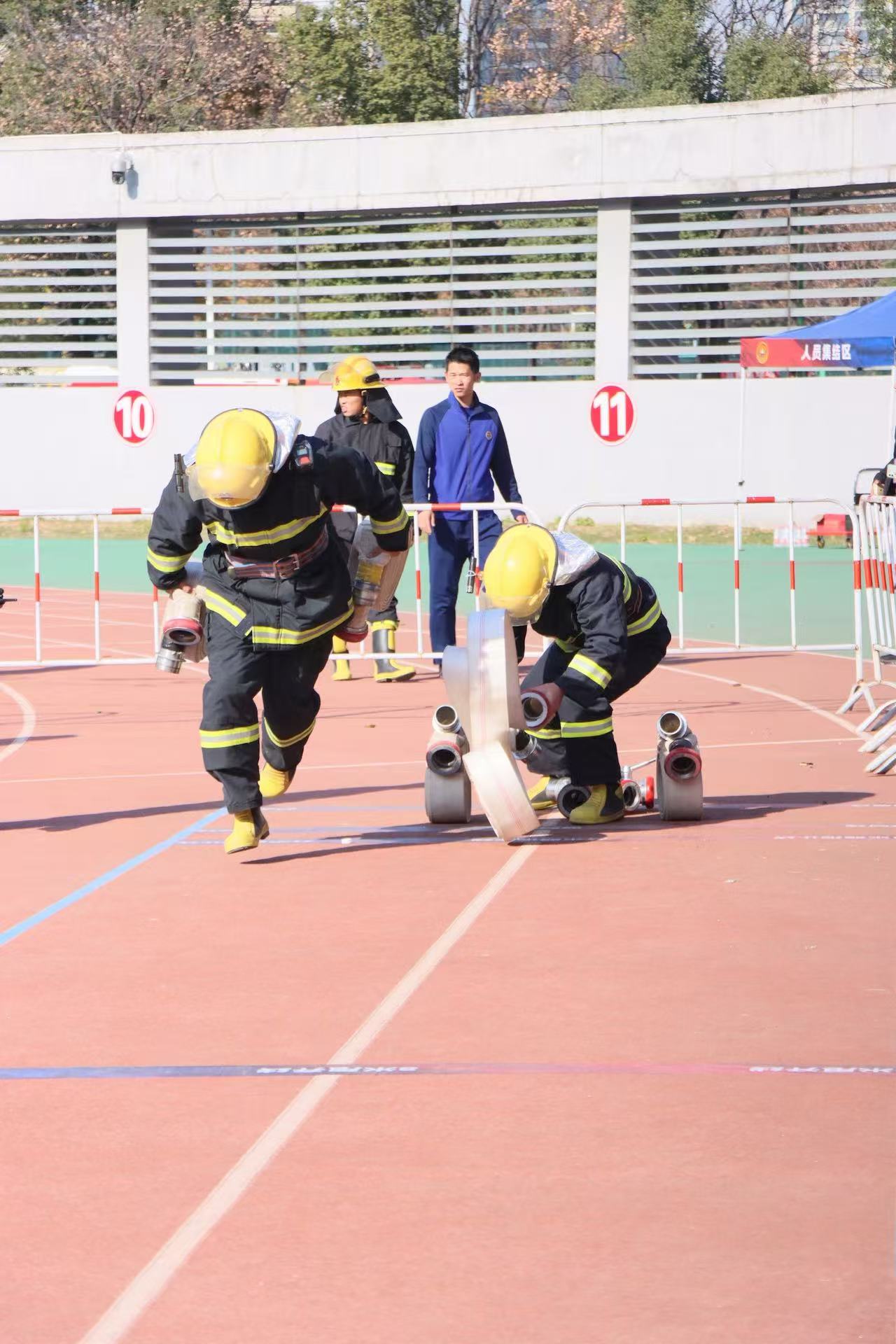本次大赛以“以练促战强技能,凝心聚力保平安”为主题,聚焦校园消防安全核心需求,设置了装备穿戴、水带连接、模拟灭火等10项实战化竞赛科目,全面检验各高校消防队伍的专业知识储备、应急处置能力和战术配合水平。比赛现场,我校参赛队员以昂扬的姿态投入各项角逐。在水带连接项目中,队员们动作娴熟、衔接流畅,水带铺设精准无扭圈,接口衔接牢固无卡口,整套操作一气呵成。在模拟灭火环节,严格遵循“先控制、后消灭”的原则,熟练运用灭火器材果断处置,精准完成每一个操作步骤;在装备穿戴科目中,队员们争分夺秒、规范高效,充分展现了日常训练的扎实成效。从单兵技能比拼到团队协同作战,每一个动作都彰显着专业素养,每一次配合都凝聚着团队力量。