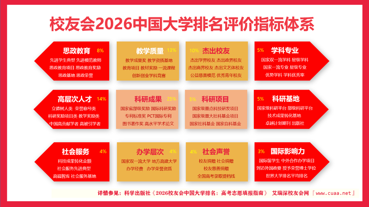 校友会2025中国大学排名评价指标体系由办学层次、思政教育、教学质量、杰出校友、高层次人才、学科专业、科研项目、科研基地、科研成果、社会服务、社会声誉和国际影响力12大一级指标组成,围绕着“大平台、大团队、大项目、大成果、大校友”体系框架展开系统评价,涵盖的评价指标高达900多项。
