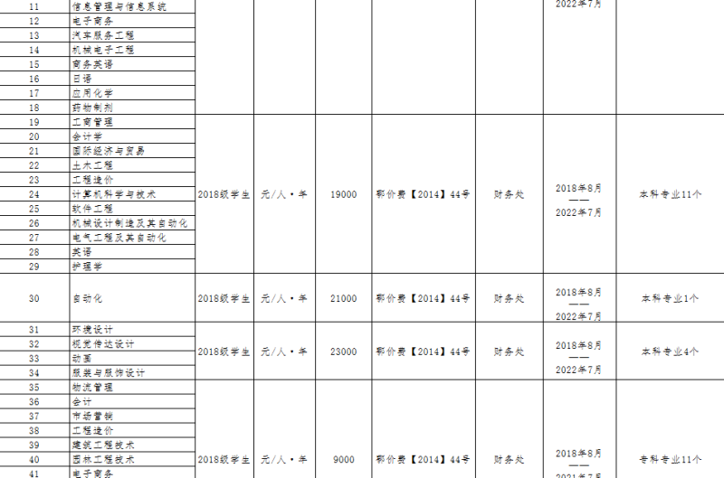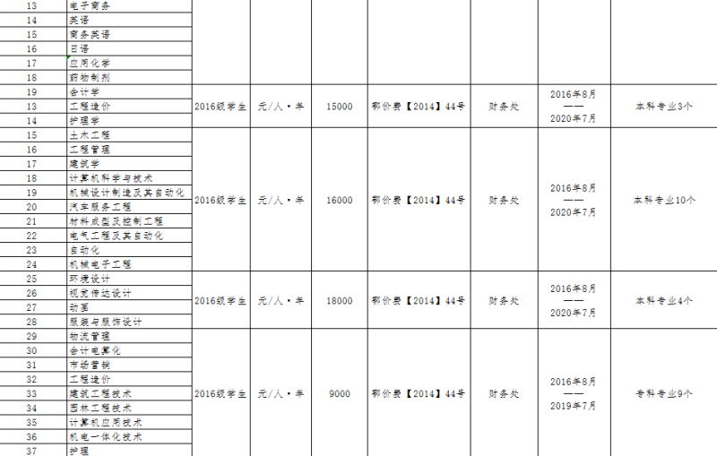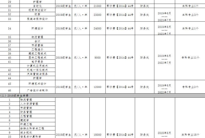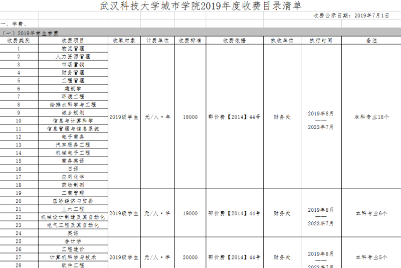 武汉科技大学城市学院2019年度收费目录清单