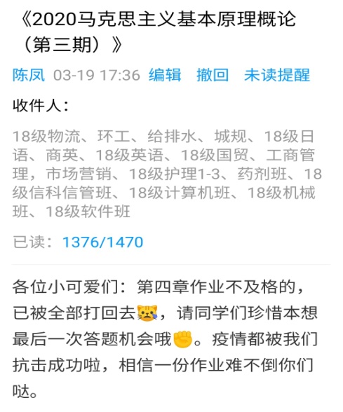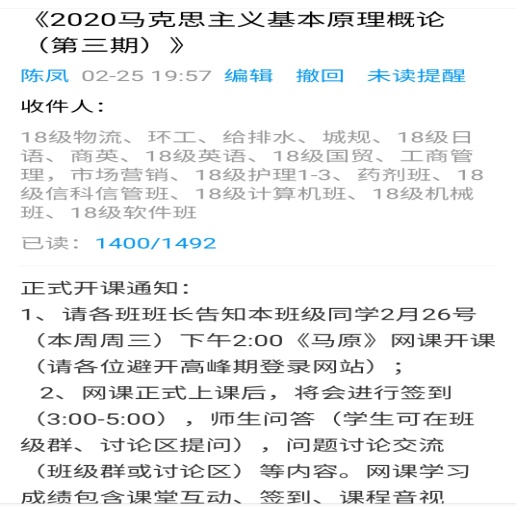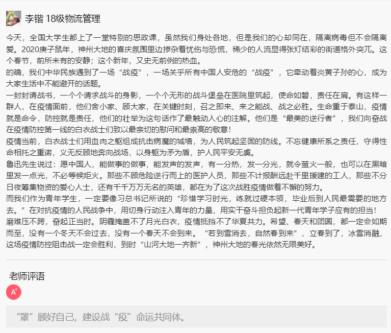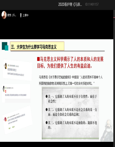 2018级机械专业学生王鸿春说:“虽然是网上教学,但老师负责,让我们更好地了解了马克思主义,也使我们更加深刻地认识到了《马克思主义基本原理概论》课程的重要性,在疫情面前更加体现得淋漓尽致。”2018级护理班学生江梦婷说道:“老师的课讲得非常好,有不懂的地方老师都会耐心解惑,当任务慢于别人时,老师也会积极地提醒我们。听老师讲课,心会得到宁静。”
