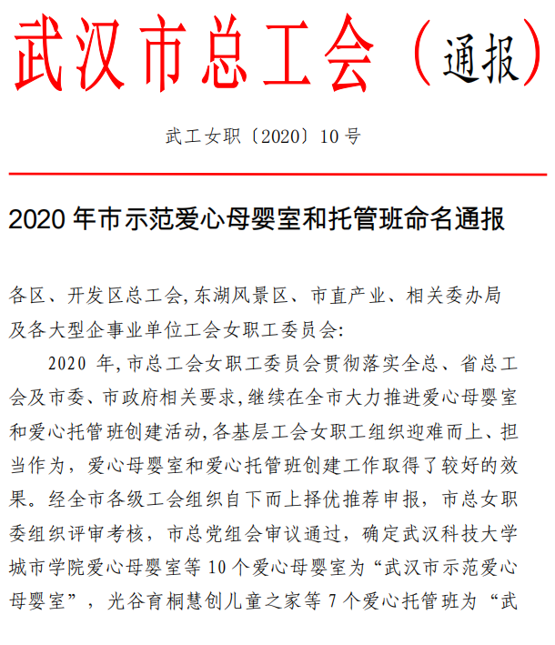 新闻网讯(记者 钟亮)近日,武汉市总工会女职工委员会发布关于2020 年市示范爱心母婴室和托管班命名通报,我院爱心母婴室荣获 “武汉市示范爱心母婴室”称号。