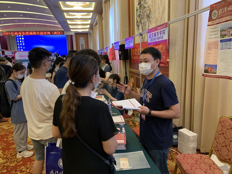 “我的成绩高出本科分数线5分,特别喜欢武汉城市学院,第一志愿报你们学校,录取的概率大不大?” 在招生宣传现场有一个考历史的考生询问招生老师,一边询问一边记录相关信息。