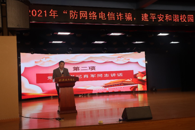 党委副书记肖军致开场词,向到场的嘉宾和师生致以诚挚的问候。肖军表示,学校高度重视防网络电信诈骗工作,成立了专门机构,划拨专项经费,建立有效管理机制,全校上下齐动员,共同努力,初步形成了部门联动、校部班一体化的工作模式,实现了“日日有提醒、周周讲安全、月月有点评”的工作氛围,先后组织防诈骗宣讲会10余场,每周召开主题班会,设置班级安全员,将防诈骗提示、案例信息、防诈骗方式方法等在班级进行宣传,将防诈骗警示要点粘贴到学生寝室,提高学生防骗意识,确保学生安全。