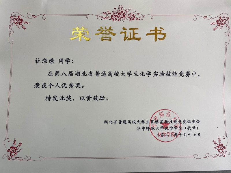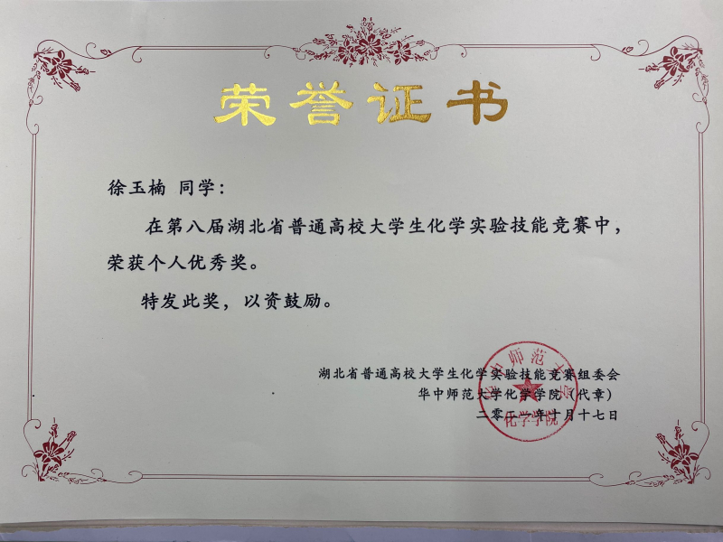 新闻网讯(通讯员姜晓晔 邵哲)10月15-17日,我校医学部制药系6名学生参加第八届湖北省普通高等学校大学生化学实验技能竞赛,并取得较好成绩。2020级应用化学专业学生向安然,2019级药物制剂专业学生徐玉楠、杜潆潆3人荣获个人优秀奖,学校荣获优秀组织奖。