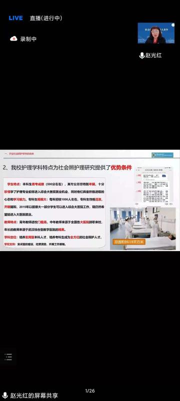 赵光红表示,中国人口老龄化速度及规模前所未有,社会发展对社会照护提出了迫切要求,社会照护的重要性与日俱增。我校教师团队具备临床实践经验丰富、学历高等特点,同时我校大力支持护理专业的学科建设,这些都为我校展开社会照护研究提供了优势条件;护理学生规模大,专业思想牢固,学习能力强且从事护理工作意愿极高。我校将社会照护定为学科建设发展的重要方向,成立社会照护研究中心以支持和探索相关的实践和研究,事迹被人民网、中新网、湖北日报、楚天都市报等多家媒体争相报道。同时,我校将社会照护教育纳入人才培养的重要内容,获批多项国家社科基金重点项目。