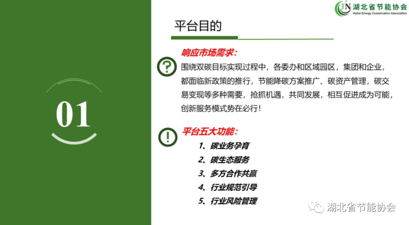 双碳平台负责人、青芥一合董事长薛菲博士介绍,该平台汇聚了节能协会会员单位、高校与研究机构、社团和行业组织,协助政府和企业对接绿碳产业链的咨询、培训、研究、标准、检测、认证等服务资源,以低碳技术创新、绿色智造变革、生态商机共拓、碳资产价值转化、生态文明传播为使命,结合协会节能业务传统优势,为全社会提供碳咨询、碳培训、碳鉴定、碳交易、碳金融、碳减排诊断、碳资产开发、碳技术研发、碳行业调研、碳体系建设等十全碳服务,共同打造一个政、产、学、研、融多赢的双碳平台品牌。