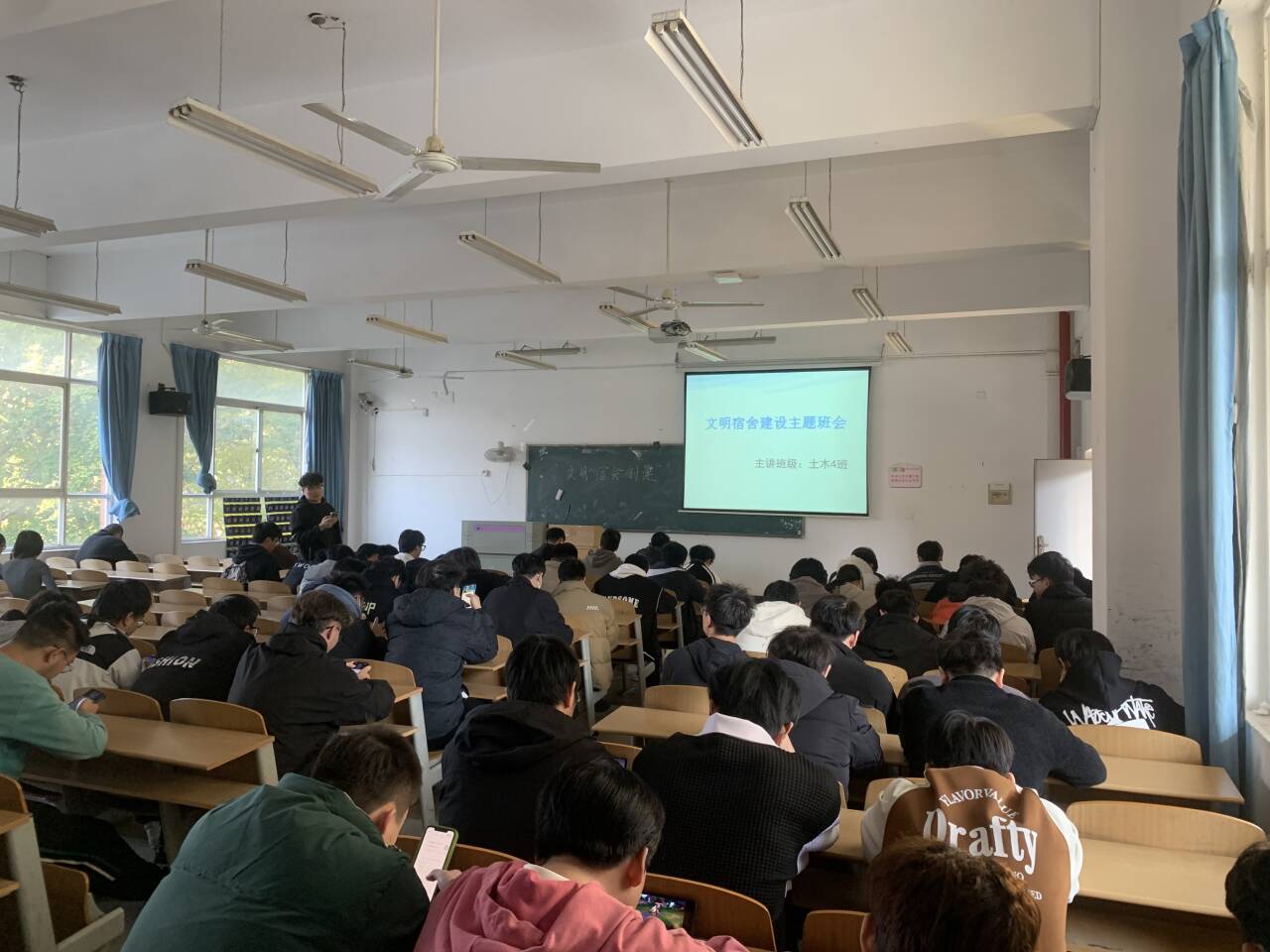 在主题班会上,各班级辅导员通过PPT举例近几年来校园因用电不当发生火灾的真实案例,提高同学们的警惕之心。让同学们了解宿舍可能存在的安全隐患,向同学们提出防范要求,提高同学们的用电安全意识。