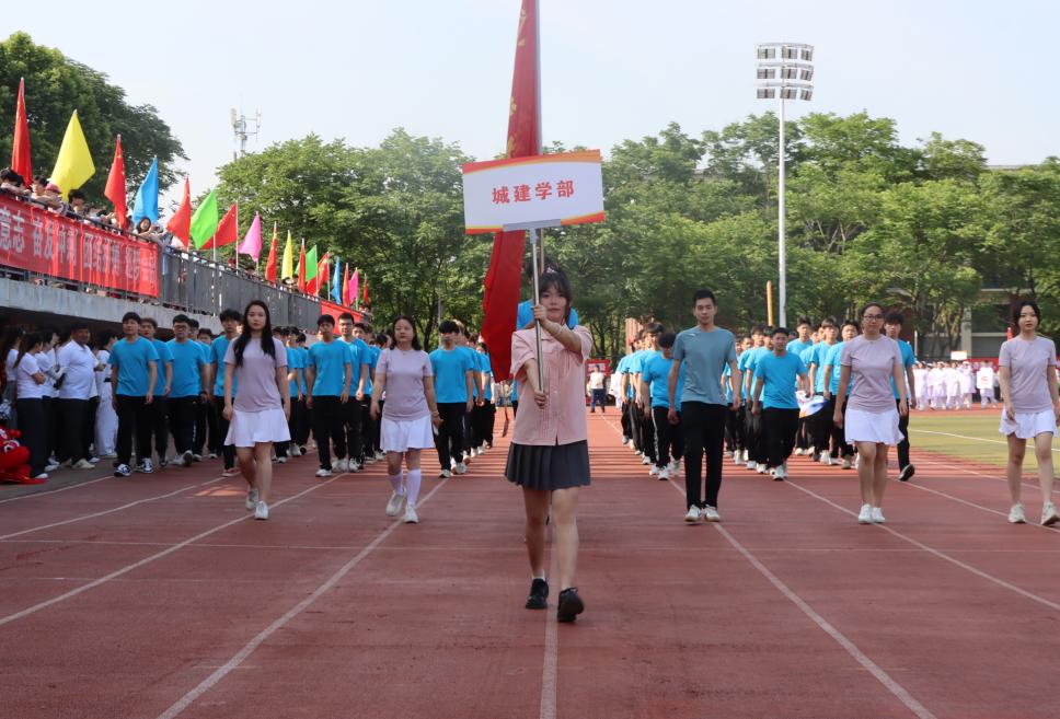 在运动会开幕式上,城建学部方阵的同学们身着统一服装,75名城建学子迈着整齐的步伐,喊着响亮的口号“心中有天地,图上有高楼”昂首阔步走向主席台。