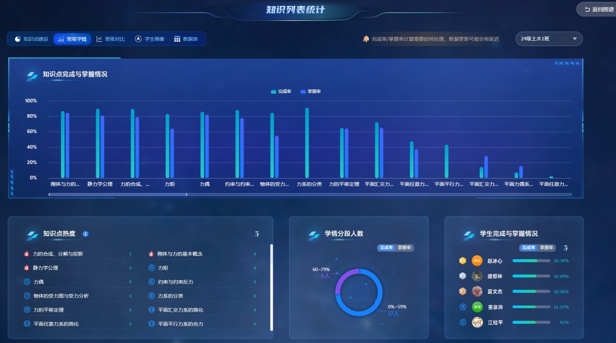 过去批改200份作业才能发现共性问题,现在AI十分钟生成教学优化方案。团队教师利用超星学情分析系统,实时追踪学生预习、课堂互动、作业测试等全流程数据,构建涵盖“矢量运算熟练度”“约束条件分析能力”等多维力学素养评价模型。系统通过机器学习识别学生错题中的认知偏差,自动生成“力学体检报告”。根据学情分析,团队教师实时把控教学情况,动态调整教学内容,真正实现精准教学。