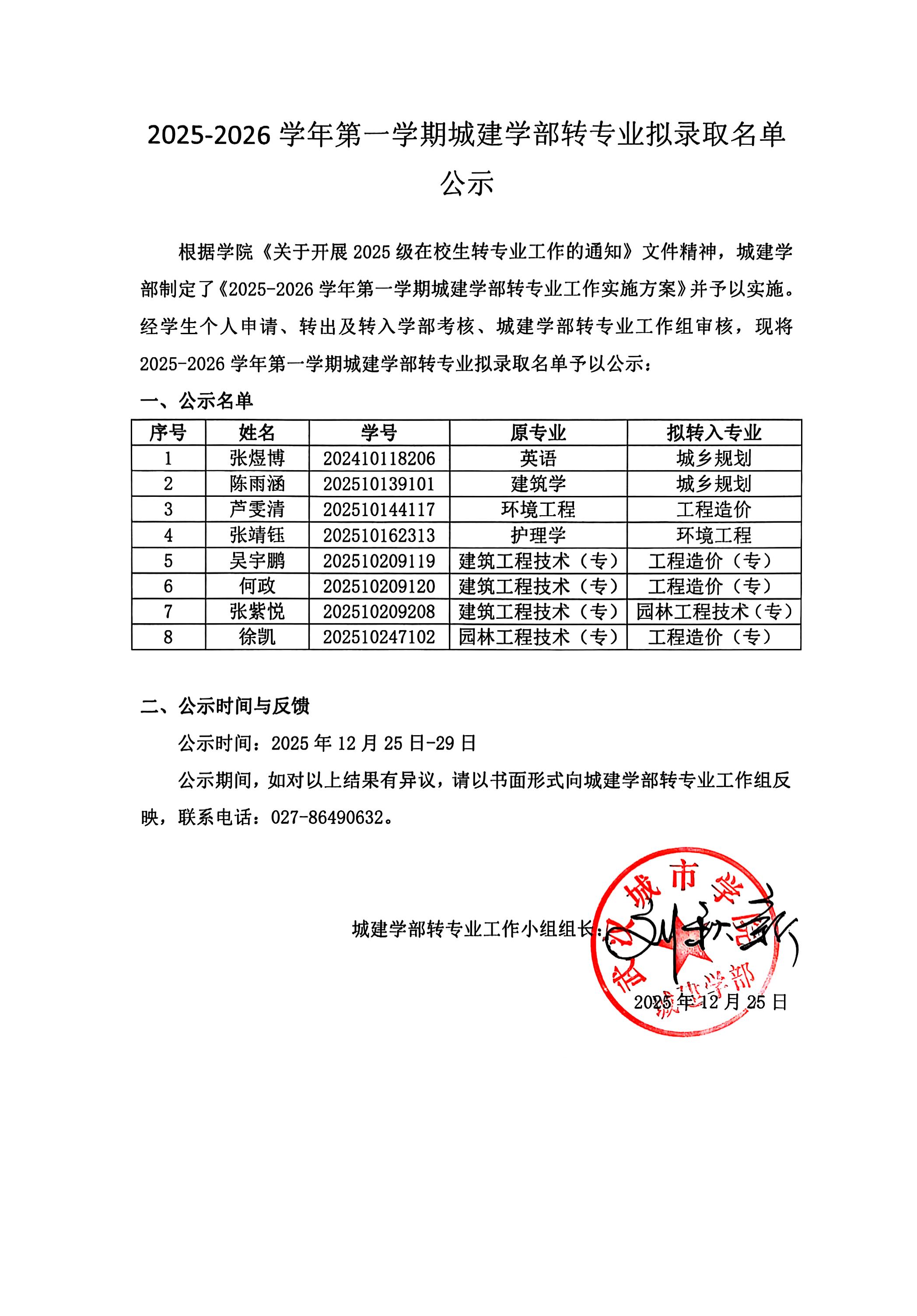 2025-2026学年第一学期城建学部转专业拟录取名单公示