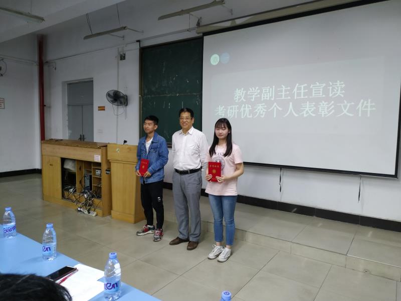 大会伊始,学部副主任鄢小虎老师宣读了《关于表彰2019届毕业生荣获“考研优秀奖”的决定》。据悉,我学部2019届毕业生共有58名学子考取国内外研究生,其中3名学子考取海外的大学研究生,录取率达11%,考研成绩喜人。鄢小虎老师劝勉在场学子,说道:“希望受表彰的个人珍惜荣誉,戒骄戒躁,奋发努力,争取更好的成绩。希望城建学部全体同学以获奖的同学为榜样,坚定目标,不断进取,奋力拼搏,力争为学部的学风建设做出新的贡献。”刘秋新主任为获奖学子颁奖。