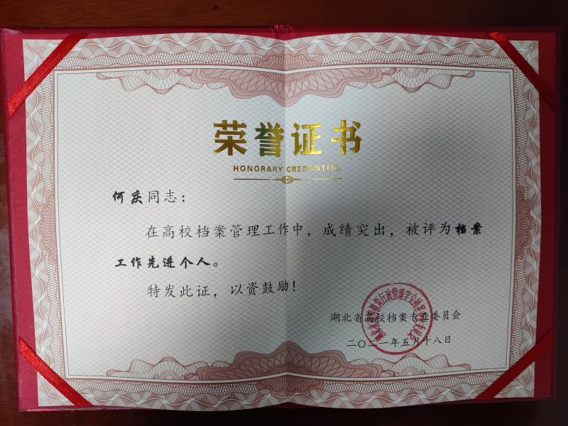 在此次会议上,武汉城市学院被授予“档案工作先进单位”荣誉称号,万青同志被评为“档案工作优秀管理者”荣誉称号,何庆同志被评为“档案工作先进个人”荣誉称号并颁发了证书。