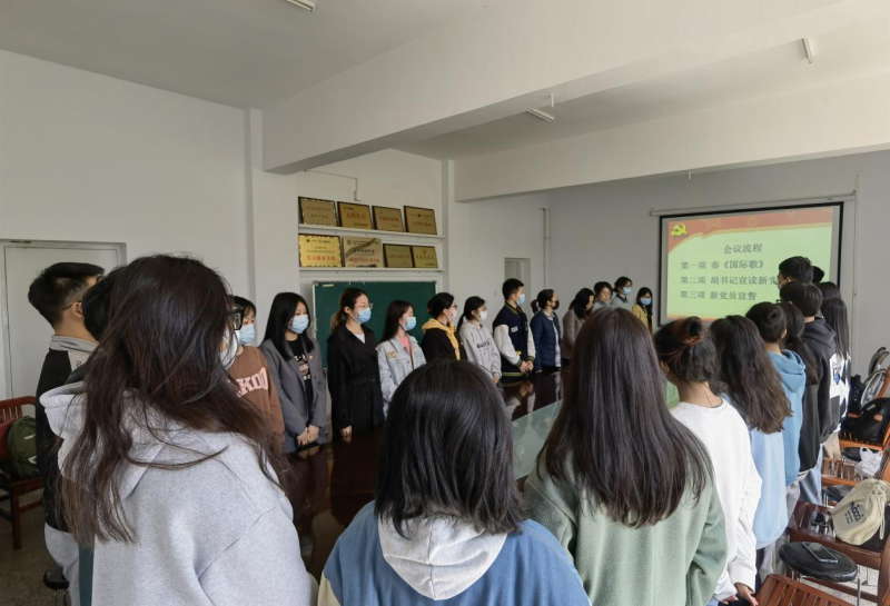 2022年3月9日中午12:10外语学部党总支在行政楼B316室举行了预备党员集体入党宣誓仪式,此次会议主题是“赤诚初心跟党走,提升自我成大器”。会议由党总支秘书程桂花同志主持,与会人员有党总支副书记胡艳华同志、学生一支部书记张亚雯同志、学生二支部书记梁鸽同志、学生三支部书记周雅乔同志、老党员代表刘诗凡同志、以及2021年12月8日新入党的26名同志。
